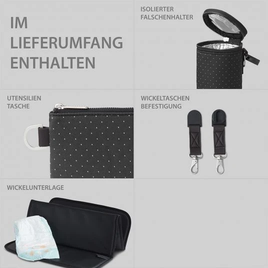 Für Babys Fläschchen gibt es einen isolierten Flaschenhalter, den Du einzeln entnehmen kannst. Dieser ist ebenfalls im Design der Tasche gehalten und hält den Fläschcheninhalt länger warm oder kalt. Mit der pflegeleichten Wickelunterlage kannst Du Deinem Baby überall unterwegs hygienisch die Windel wechseln. Des Weiteren ist eine kleine Utensilientasche enthalten, in der Du Kleinigkeiten wie Deinen Schlüssel, Geld, Bankkarte etc. unterbringen kannst. Außen hat die Wickeltasche zwei weitere Reißverschlussfächer und zwei offene Fächer, für die Dinge, die Du gerne schnell zur Hand hast.