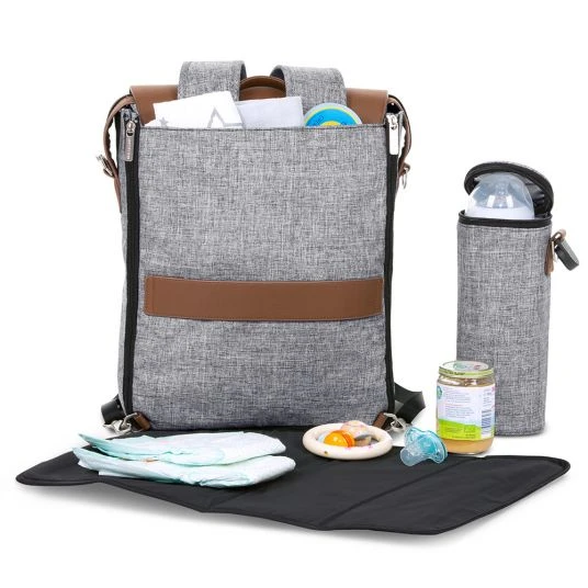 Für Babys Fläschchen gibt es einen isolierten Flaschenhalter, den Du einzeln entnehmen kannst. Dieser ist ebenfalls im Design der Tasche gehalten und hält den Fläschcheninhalt länger warm oder kalt. Mit der pflegeleichten Wickelunterlage kannst Du Deinem Baby überall unterwegs hygienisch die Windel wechseln. Des Weiteren ist eine kleine Utensilientasche enthalten, in der Du Kleinigkeiten wie Deinen Schlüssel, Geld, Bankkarte etc. unterbringen kannst. Außen hat die Wickeltasche zwei weitere Reißverschlussfächer und zwei offene Fächer, für die Dinge, die Du gerne schnell zur Hand hast.
