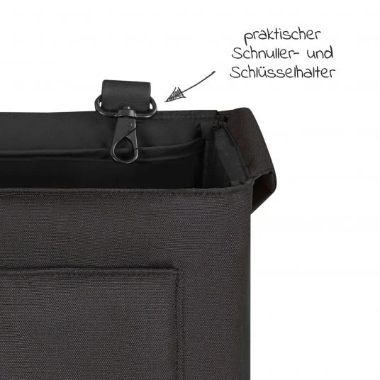 Des Weiteren ist eine kleine Utensilientasche enthalten, in der Du wichtige Kleinigkeiten, wie Deinen Schlüssel, Kleingeld etc. verstauen kannst. An dem praktischen Karabiner in der Wickeltasche kannst Du diese Utensilientasche, aber auch Deinen Wohnungsschlüssel befestigen und ersparst Dir das Suchen danach.