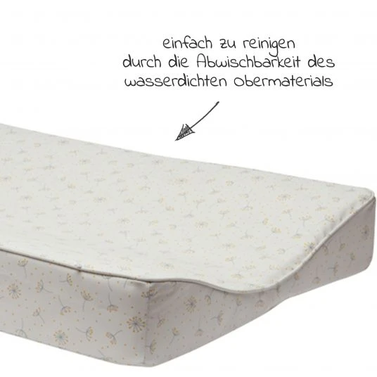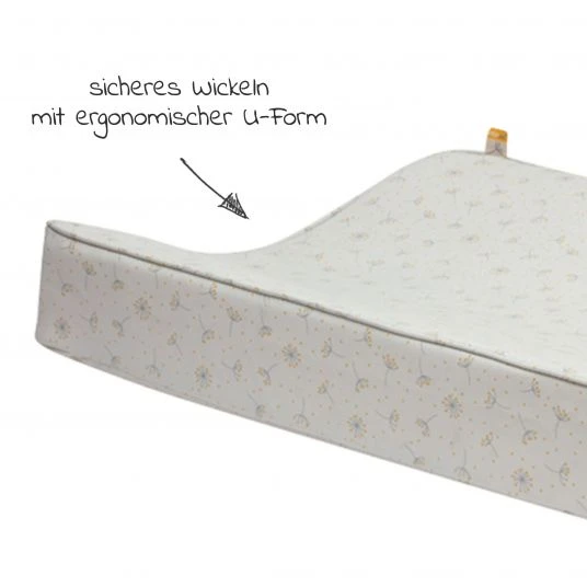 Auf der weichen Wickelauflage, bestehend aus speziellem Komfortschaum, liegt Dein Nachwuchs sehr bequem. Dabei bist Du flexibel und kannst die Auflage auf jeder vorhandenen Kommode einem anderen Möbelstück mit ebener Fläche nutzen. Der angesagte Pusteblumen-Print in dezenter Farbgebung verschönert jedes Kinder- oder Badezimmer. Die wasserabweisende Oberfläche ist abwischbar und so im Nu wieder sauber. Alle Materialien sind dank intensiver Kontrolle völlig unbedenklich für Dein Baby, auch nach längerer Nutzung.