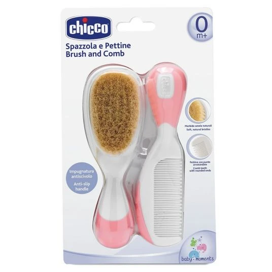 Das Set aus Kamm und Bürste von Chicco eignet sich hervorragend zur Pflege von feinem Babyhaar. Die Bürste hat weiche Naturborsten aus Ziegenhaar. Die Borsten schonen Babys Haarstruktur schonen und massieren gleichzeitig sanft die Kopfhaut. Der Kamm hat extra abgerundete Spitzen.