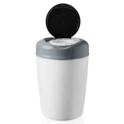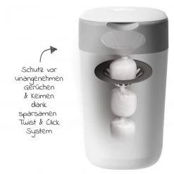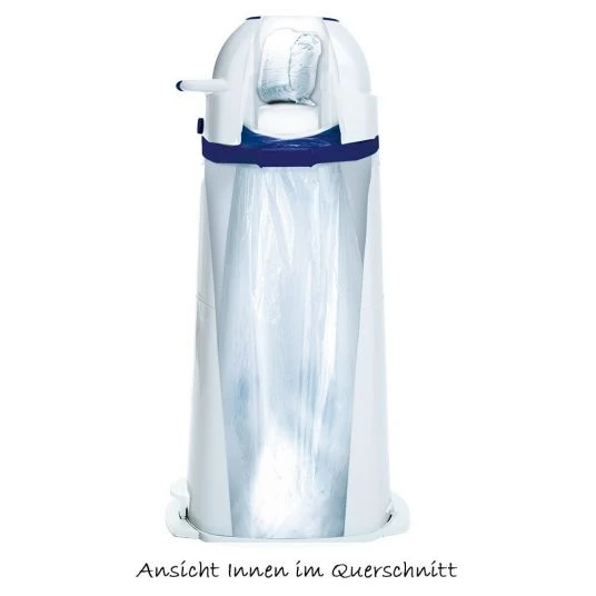 Die benutzte Windel legen Sie einfach in die obere Öffnung und drehen den Deckel am Tragegriff herum. Die Windel fällt so direkt in die Plastiktüte im Inneren. Das Besondere: Sie müssen den Windeleimer nicht öffnen und unangenehme Gerüche bleiben zuverlässig verschlossen.