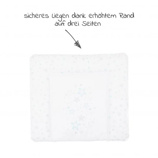 Wickeln finden die Kleinsten nicht immer so toll, umso wichtiger ist es, dass sie sich an ihrem Wickelplatz wohlfühlen. Auf der Fillikid Wickelauflage Softy 75 x 85 cm – Blue Stars – Weiß liegt Dein kleiner Schatz gut und bequem gepolstert. Damit es dabei jederzeit möglichst sicher liegt, ist die Auflage mit einem 3-seitigen, erhöhten, abgesteppten Rand ausgestattet.