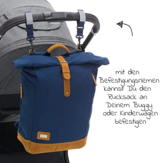 Es muss nicht immer eine klassische Wickeltasche sein: Wer beide Hände unterwegs frei haben und dennoch alles Wichtige zum Wickeln dabei haben möchte, findet im Wickelrucksack Rolltop Canvas mit Echtlederapplikationen – Navy von Fillikid den idealen Begleiter. Der Rucksack sorgt dank seiner Öffnung im Rolltop-Styl für Flexibilität. Muss mal etwas mehr mitgenommen werden, rollst Du den Rucksack auf und hast im Handumdrehen zusätzlichen Stauraum oder Platz für längliche Gegenstände. Zusammengerollt lässt er sich einfach mit einem Magnetverschluss schließen. Der sportliche Rucksack ist aus hochwertigem Canvas gefertigt – robustem Leinen Segeltuch aus reiner Baumwolle. Verschlüsse und Applikationen aus echtem Leder.