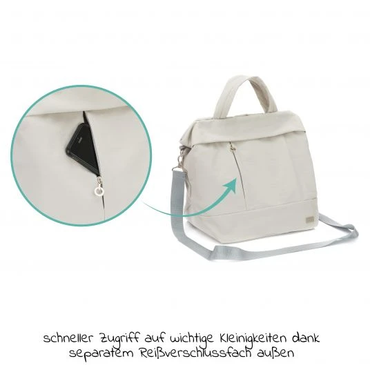 Die kompakte Tasche mit praktischem Doktortaschenverschluss bietet Dir jede Menge an Stauraum dank großem Hauptfach und vieler durchdachter Innenfächer sowie einem Außenfach mit Reißverschluss für Wertgegenstände. Sämtliche Steckfächer bieten genügend Platz für Feuchttücher und Windeln. Mit wenigen Handgriffen hast Du alles parat und kannst Deinen kleinen Schatz bequem überall wickeln.
