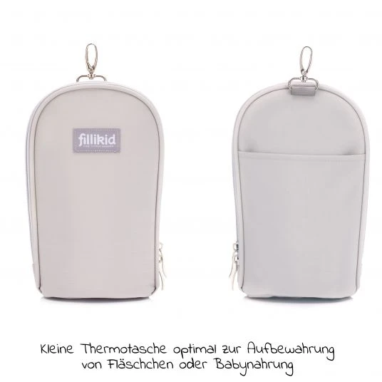 Die mitgelieferte Thermotasche in gleichem Farbton hält jedes Getränk über längere Zeit hinweg warm oder kalt und lässt sich auch innen oder außen befestigen. Dazu erhältst Du eine Fillikid Wickelunterlage, die sich einfach zusammenfalten lässt und Deinem Baby eine komfortable Liegefläche bietet. Der robuste Nylonstoff ist sehr pflegeleicht und kann mit einem feuchten Tuch abgewischt werden, sollte sie doch auf dem Spielplatz einmal recht schmutzig werden. Dank der praktischen Befestigung mit Karabinerhaken lässt sich die Wickeltasche jederzeit an den Kinderwagen anbringen.