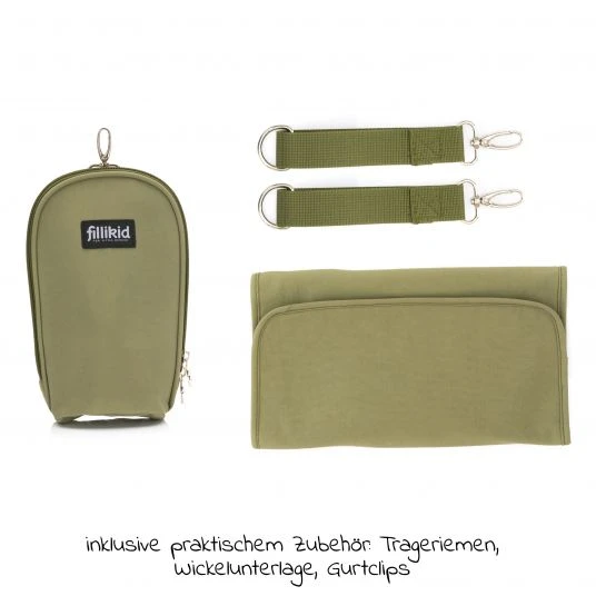Mit Baby oder Kleinkind unterwegs zu sein bedeutet: Du brauchst von den Windeln über Feuchttücher bis hin zu kleinen Snacks oder einem Schnuller vieles an Zubehör! Mit der Wickeltasche Palma mit Wickelunterlage und Thermotasche – Oliv von Fillikid hast Du alles Wichtige griffbereit verstaut und bist dazu noch besonders modisch unterwegs. Ob als lässiger Shopper mit Trageriemen, als stylishe Henkeltasche oder entspannt am Kinderwagen angebracht – die Fillikid Wickeltasche wird garantiert zum langjährigen Begleiter.