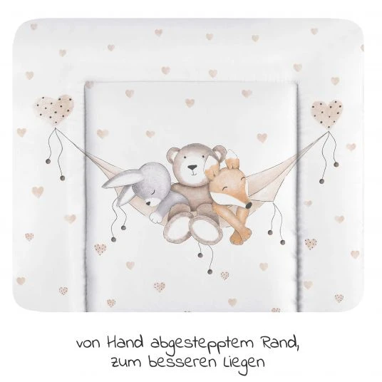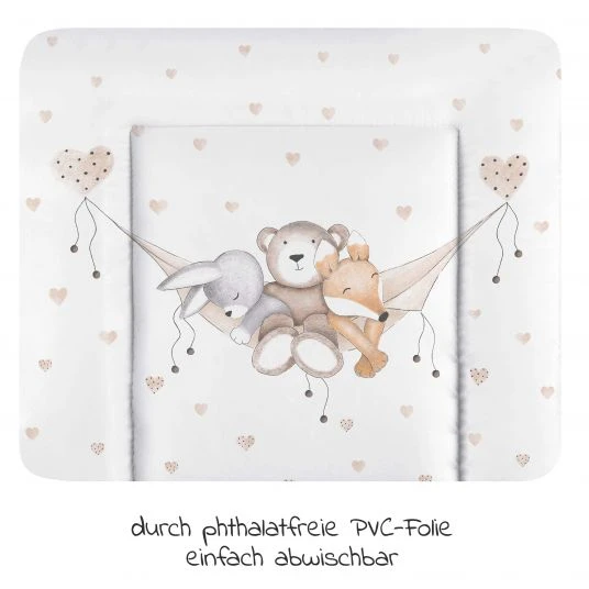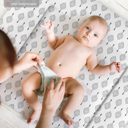 Das schöne Design Schlummerbande mit bezaubernder Musterung, niedlichem Hasen, Bären und putzigen Fuchs lässt Deinen Wickeltisch schnell zum süßen Hingucker im Babyzimmer werden. Durch die robuste, pflegeleichte Folie bleibt das Innenkissen immer hygienisch sauber und trocken. Sollte während dem Wickeln ein Malheur passieren, lässt sich die Folie der Auflage einfach mit einem feuchten Tuch abwischen.