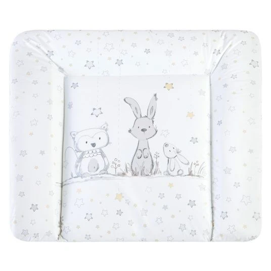 Hübsche und praktische Folien-Wickelauflage Softy Häschen & Eule Weiß von Julius Zöllner. Die Oberfläche aus abwischbarer, phthalatfreier Folie kannst Du leicht und schnell mit einem feuchten Tuch reinigen. Auf der Füllung aus weichem Polyestervlies liegt Dein Baby beim Wickeln besonders bequem. Der erhöhte, abgesteppte Rand sorgt dafür, dass Dein Kleines nicht so leicht von der Auflage rollen kann. Dank der pflegeleichten und strapazierfähigen Folie bleibt das Innenkissen immer hygienisch sauber und trocken. Das süße, babygerechte Motiv ist ein hübscher Hingucker im Kinderzimmer. Du kannst die Wickelauflage wenden und beidseitig benutzen.