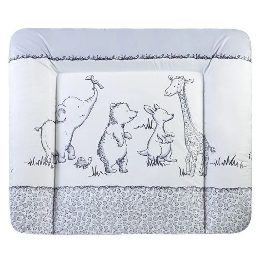 Hübsche und praktische Folien-Wickelauflage Softy Safari Grau von Julius Zöllner. Die Oberfläche aus abwischbarer, phthalatfreier Folie kannst Du leicht und schnell mit einem feuchten Tuch reinigen. Auf der Füllung aus weichem Polyestervlies liegt Dein Baby beim Wickeln besonders bequem. Der erhöhte, abgesteppte Rand sorgt dafür, dass Dein Kleines nicht so leicht von der Auflage rollen kann. Dank der pflegeleichten und strapazierfähigen Folie bleibt das Innenkissen immer hygienisch sauber und trocken. Das süße, babygerechte Motiv ist ein hübscher Hingucker im Kinderzimmer. Du kannst die Wickelauflage wenden und beidseitig benutzen.