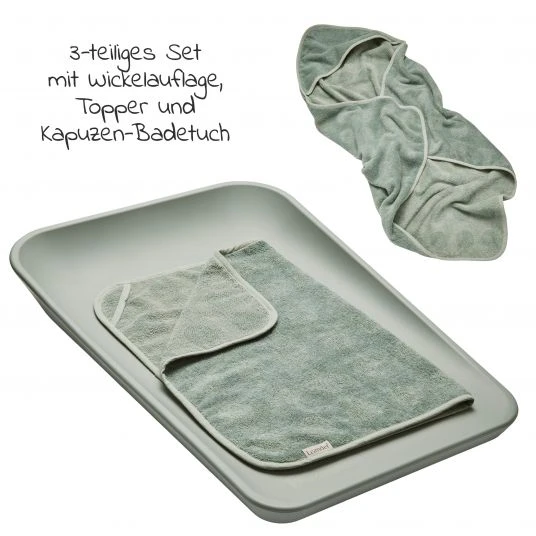 Wir kennen es alle. Wickeln ist oftmals ein Balanceakt und Dein Baby hat nicht immer Lust darauf, sich an und ausziehen zu lassen. Aber umso wohler es sich fühlt, umso entspannter wird auch der Wickelvorgang. Das praktische 3-teilige Set Leander Wickelauflage & Wickelkissen Matty™ inkl. Auflage Topper und Kapuzen-Handtuch Hoodie in Sage Green bietet dir eine besonders schöne Wickelstation. Das umfangreiche Set beinhaltet eine softe Wickelauflage, einen passenden Topper und ein Kapuzen-Badetuch in dezentem Farbton.