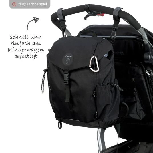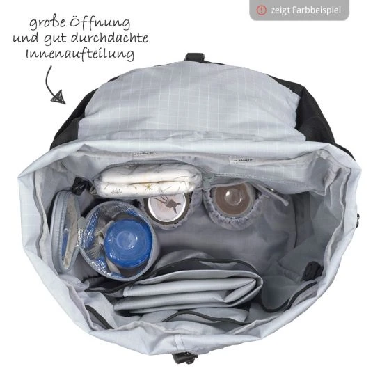 Ein gut durchdachtes Innenleben, Staufächer innen und außen sowie das umfangreiche Wickelzubehör runden den Rucksack ab. Ausgestattet mit einer wasserabweisenden Wickelunterlage, einem isolierten Flaschenhalter, einer herausnehmbaren Gläschenhalterung, einer Kinderwagenbefestigung und einer kleinen Utensilientasche hat man alles, was man unterwegs braucht.