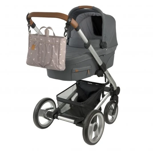 Bei Bedarf kannst Du sie an den beiden Henkeln einfach aus der größeren Tasche herausziehen. Das erspart Dir das ein Umräumen des Babyzubehörs von einer Tasche in eine andere. Mit dabei sind auch zwei praktische Befestigungsösen, die das Anbringen am Kinderwagen mit zusätzlichen Haken ermöglichen.