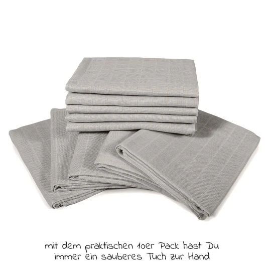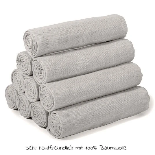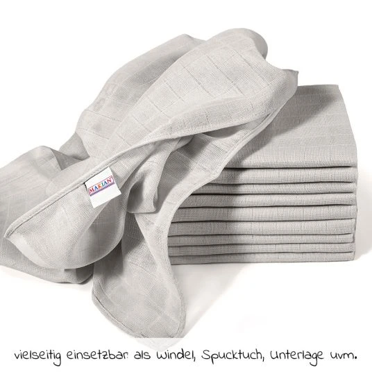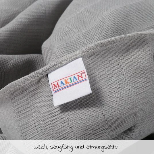Mittlerweile ist die Auswahl an verschiedenen Windelarten sehr groß, die Mullwindeln bleiben dennoch sehr beliebt und weiterhin ein Klassiker. Mit den Makian Mullwindeln 80 x 80 cm in Grau im praktischen 10er Pack hast Du immer wunderbare Alltagshelfer für Zuhause und unterwegs dabei. Sie sind nicht nur als Windel verwendbar, sondern auch als Waschlappen, Spucktuch, Wickelunterlage oder nach der Windelzeit sogar als Putztuch ideal geeignet.