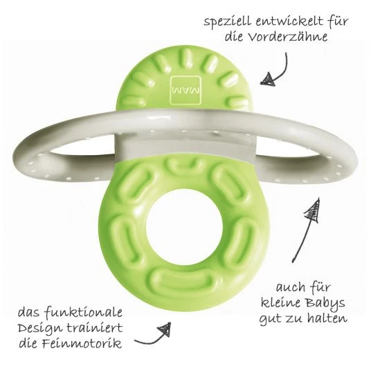Der Mini-Beißring Bite & Relax Phase 1 in Grün von MAM wurde speziell für die 1. Zahnungsphase Deines Babys entwickelt und sorgt rasch für Linderung. Die Form des Beißrings ist extra auf die Vorderzähne abgestimmt, welche als erstes durchbrechen. 4 verschiedene Oberflächenstrukturen und 2 unterschiedliche Materialien massieren angenehm das Zahnfleisch Deines Babys und bieten abwechslungsreiche Beißmöglichkeiten.