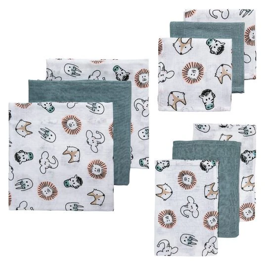 - praktisches 9-teiliges Set mit Mullwindeln, Pflegetüchern & Waschhandschuhen im niedlichen Tier-Design