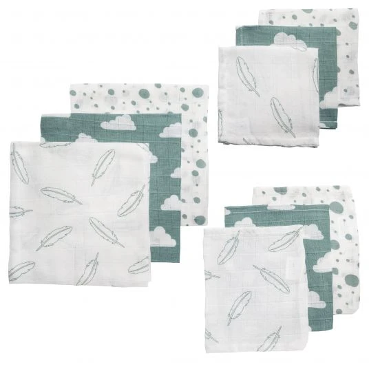 Mit dem 9-teiligen Meyco Starter Set Mulltücher Federn Wolken Dots in Stone Green bist Du perfekt ausgestattet. Die 3 Mulltücher in den Maßen 70 x 70 cm kannst Du vielseitig einsetzen – als Spucktuch, Unterlage, Sicht- und Sonnenschutz oder als Schmusetuch. Die 3 Pflegetücher sowie die 3 Waschlappen in 17 x 20 cm, in die Du mit Deiner Hand bequem reinschlüpfen kannst, unterstützen Dich bei der Pflege Deines Schatzes.