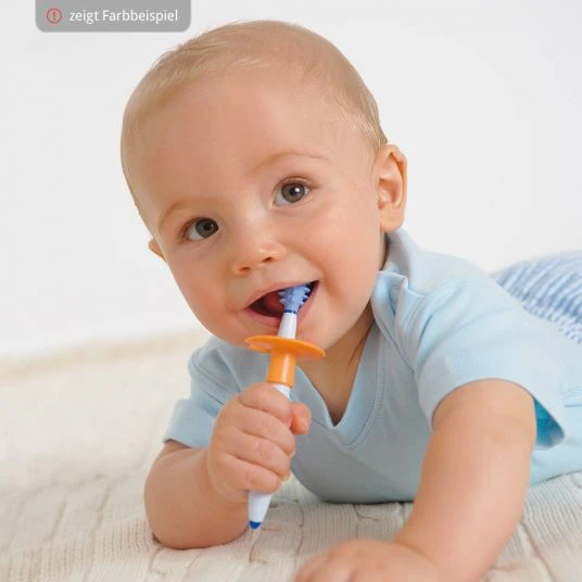 Der lange Griff bereitet Ihren Schatz auf die spätere Form seiner Zahnbürste vor. Toll: ein spezieller Schutzring verhindert, dass die Bürste zu weit in den Mundraum eingeführt wird. Gleichzeitig findet dieser als Standfuß Verwendung.