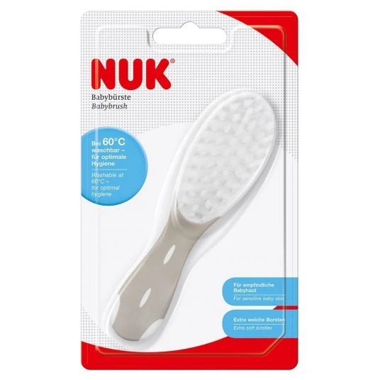 Die Babybürste mit Nylonborsten in Grau von NUK ist optimal zur sanften, täglichen Haarpflege Ihres Babys. Der große Vorteil dieser Bürste ist, dass sie bei 60°C waschbar ist und dadurch hygienischer ist.