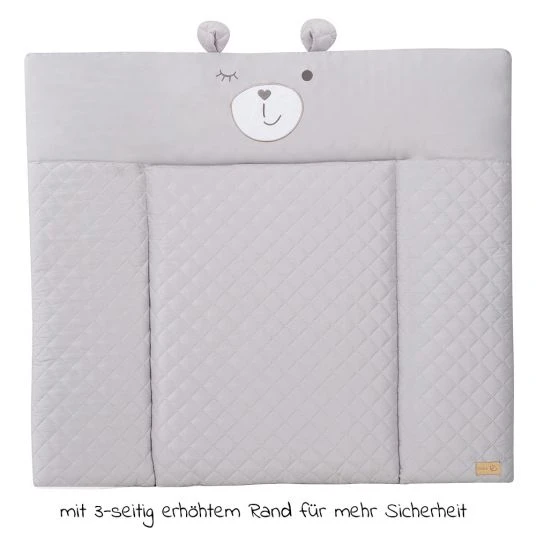 Wickeln finden die Kleinsten nicht immer so toll, umso wichtiger ist es, dass sie sich an ihrem Wickelplatz wohlfühlen. Auf der Roba Wickelauflage Soft – Roby Style Sammy Silbergrau mit Bärengesicht mit 70 x 85 cm liegt Dein kleiner Schatz gut gepolstert: Die weiche Polsterung der Auflage besteht aus flauschigem PolyesterVlies, so dass Dein Nachwuchs bequem liegen kann. Damit es dabei jederzeit möglichst sicher liegt, ist die Auflage mit einem 3-seitigen, erhöhten, abgesteppten Rand ausgestattet.