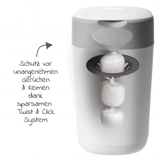 Mit dem Windeleimer Twist & Click Sangenic- Greenfilm™ in Weiß von Tommee Tippee kannst Du die schmutzigen Windeln einfach direkt am Wickelplatz entsorgen, ohne jedes Mal zur Mülltonne laufen zu müssen. Dabei können sich auch keine unangenehmen Gerüche oder Bakterien in Deiner Wohnung verbreiten. Das praktische Eindreh- und Klick-Entsorgungssystem wickelt jede Windeln einzeln in eine Folie ein. So werden Gerüche und Keime sicher eingeschlossen.
