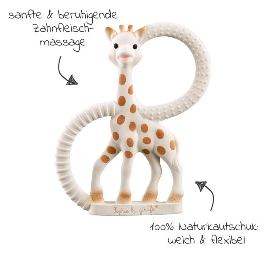 Diese unterschiedlichen Oberflächenstrukturen bieten Deinem Baby ein sehr abwechslungsreiches Beißgefühl. So lässt sich das empfindliche Zahnfleisch angenehm massieren und nimmt etwas Schmerz. Aus 100% Naturkautschuk bestehend, ist die niedliche Sophie angenehm weich, leicht und lässt sich nach der Verwendung mit einem feuchten Tuch ganz einfach abwischen.