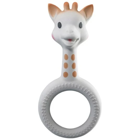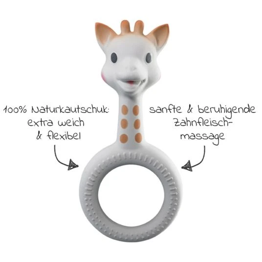 Machen sich die ersten kleinen Zähnchen bei Deinem Baby bemerkbar, ist das meistens mit Schmerzen verbunden. Die süße Giraffe als Beißring aus Naturkautschuk – Sophie la girafe® So Pure begleitet Deinen kleinen Engel durch die Zahnungsphase und trägt zur Linderung der Schmerzen bei. Der Ring, an welchem der kleine Entdecker Sophie gut festhalten kann, ist mit einer strukturierten Oberfläche ausgestattet.